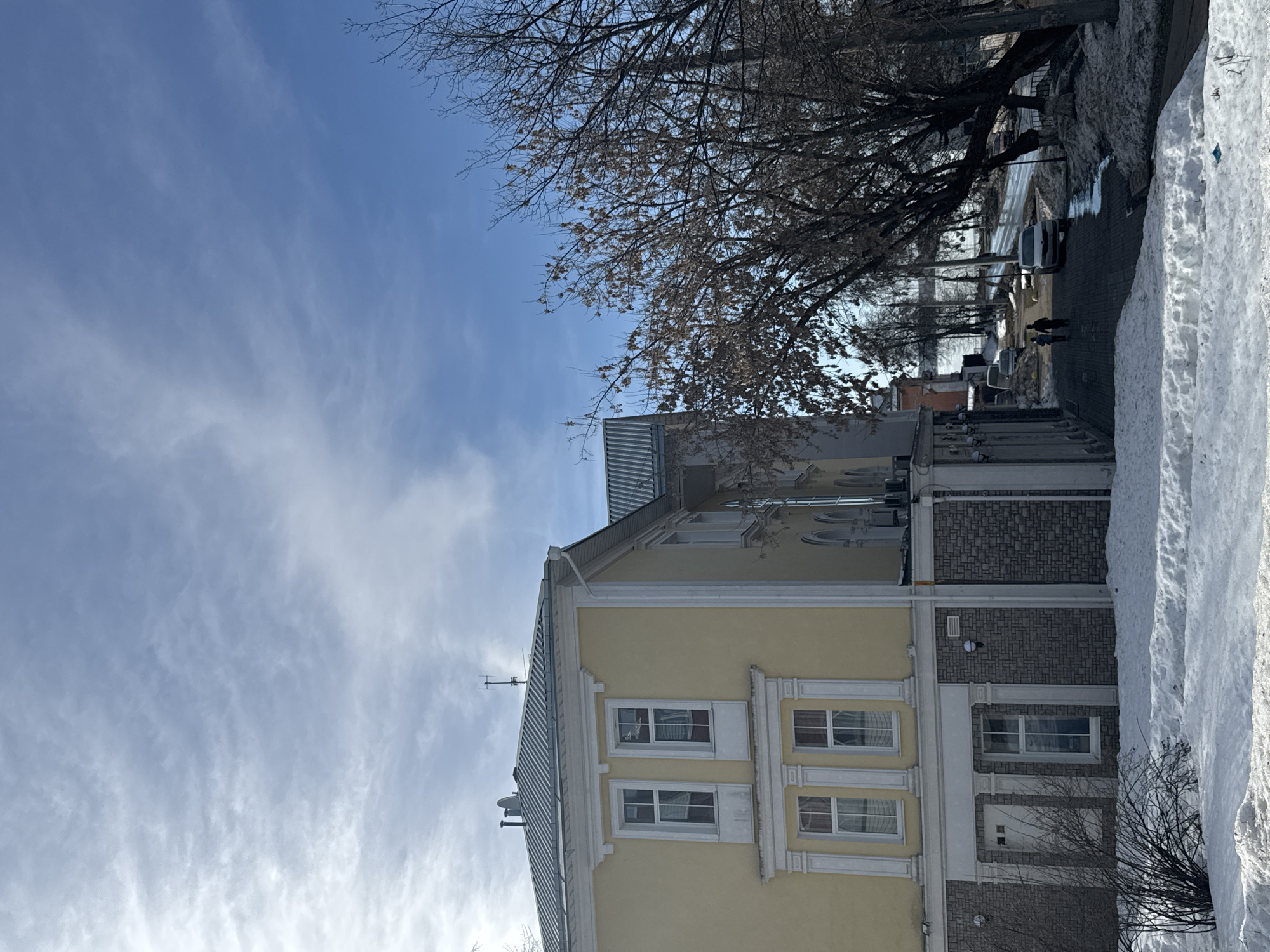 The image depicts a three-story building in Votkinsk, Russia, on a winter day. The building has a yellow facade with white trim around the windows and a gray roof. Part of the building is faced with grey stone. A barren tree is in the foreground, partially obscuring the view of the building. The sky is blue with some wispy clouds. Across from the building is a sidewalk covered with snow. Two people are walking along the sidewalk, and several parked cars are visible further down the street.