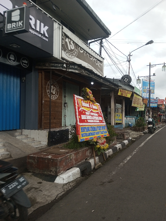 A street-level view captures a commercial area with multiple storefronts under an overcast sky. On the left, a row of multi-story buildings features various businesses. The first building has a blue roll-down shutter and an illuminated black sign reading "BRIK apparel care". Adjacent buildings display signs for "13 CIPANAS SYA SPORT" and "WARUNG SOTO IBU TITIN". A large red and white banner, adorned with colorful floral arrangements at the top and bottom, stands prominently on the sidewalk. Its text, primarily in Indonesian, announces "Selamat & Sukses", "SOFT OPENING", and lists "BRIK SHOES & APPAREL CARE" and "BINTANG CIREMAI FUJI SPORT" at the "CABANG CIPANAS" (Cipanas Branch), acknowledging "MUHAMMAD ROFI BATHAN". The sidewalk, edged by a black and white striped curb, features a weathered concrete planter box containing sparse greenery. An asphalt road occupies the right side of the frame, with a white painted line visible. A motorcycle is partially visible in the lower left, parked on the sidewalk, showing a license plate fragment "F 2326 UC". Further down the street on the right, a person in a helmet rides another motorcycle away from the camera. Overhead, a complex network of utility wires spans between poles, and streetlights are visible, including one with a single arm extending over the road and another with multiple decorative lamps further down. The visible signage and license plate details indicate a location within Indonesia, specifically referencing Cipanas.