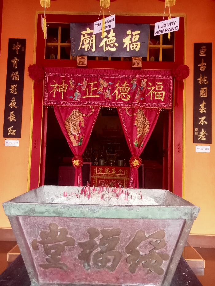 The image depicts a Chinese temple entrance. A sign reads "Toko Is Gajah Gebong" alongside "Luxury Semarang," above Chinese characters, "廟德福." A red banner with embroidered figures and tigers adorns the doorway. Below, a large incense burner displays Chinese characters. Vertical black plaques with gold writing flank the entrance, with notes saying "BATAS FOTO" near the bottom. A smaller shrine is visible inside the temple.