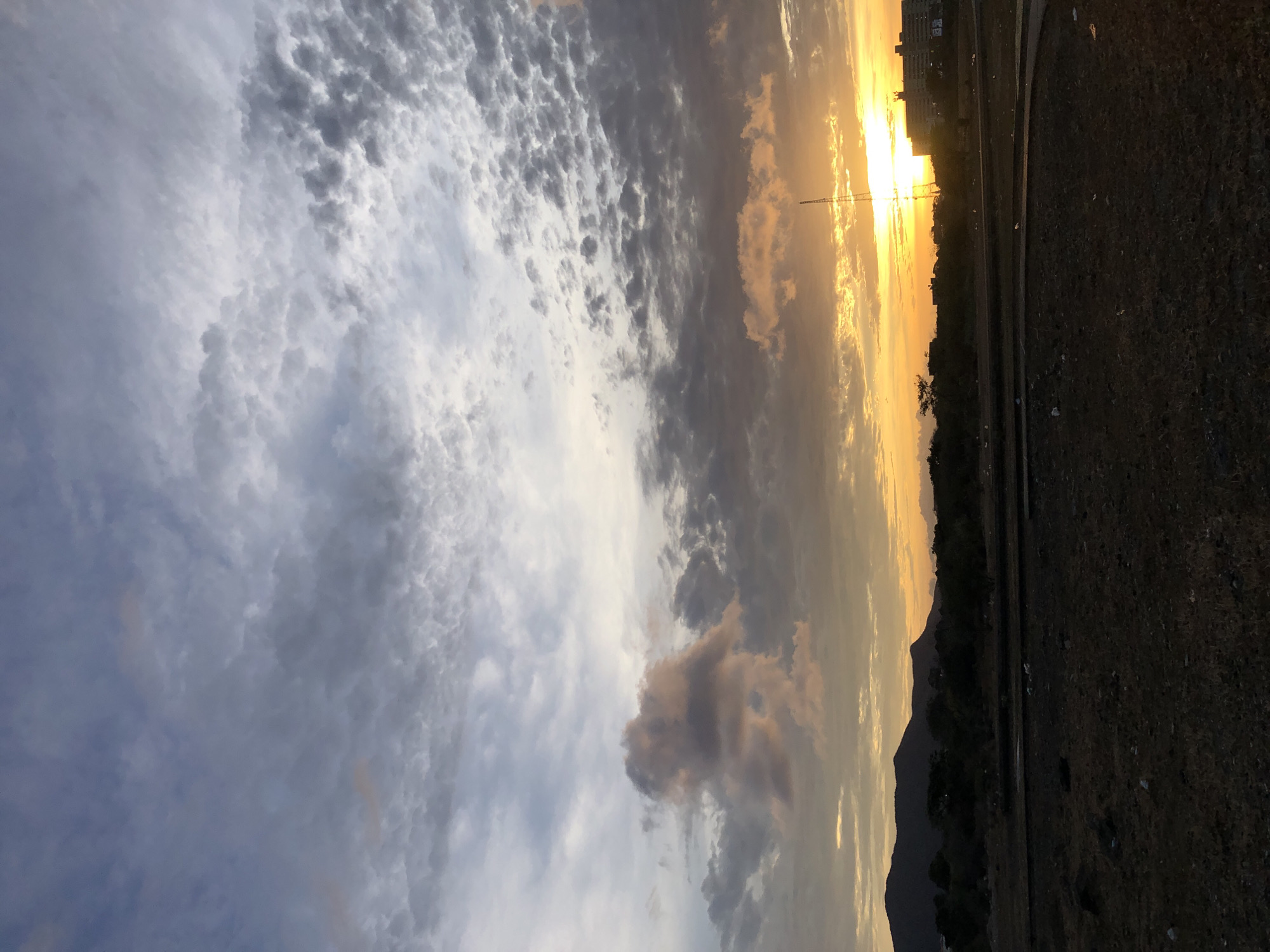 The image depicts a sunset over Juan Griego, Venezuela. The sky is filled with a mix of gray and white clouds, with a burst of bright yellow and orange light on the horizon, indicating the sun setting. Silhouetted against the light are buildings and a communication tower. Below the horizon, a dark mountain range is visible. In the foreground, there is a dark, grassy area.
