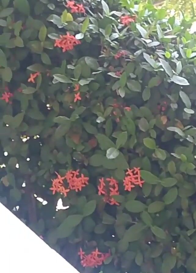 close-up view of a bush with green leaves and clusters of small red flowers. The bush appears to be growing near a white structure, possibly a wall or railing. The camera angle is low, looking slightly up at the bush. The lighting is somewhat diffused, suggesting an overcast day or indirect sunlight.