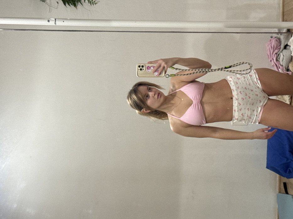 A woman takes a mirror selfie in a pink bikini top and white, floral-patterned shorts. She holds her phone with a lanyard, the case adorned with a small flower design. Her hair is blonde with bangs. The background reveals a messy room with a blue blanket and scattered clothes. A plant hangs near the top corner of the mirror.