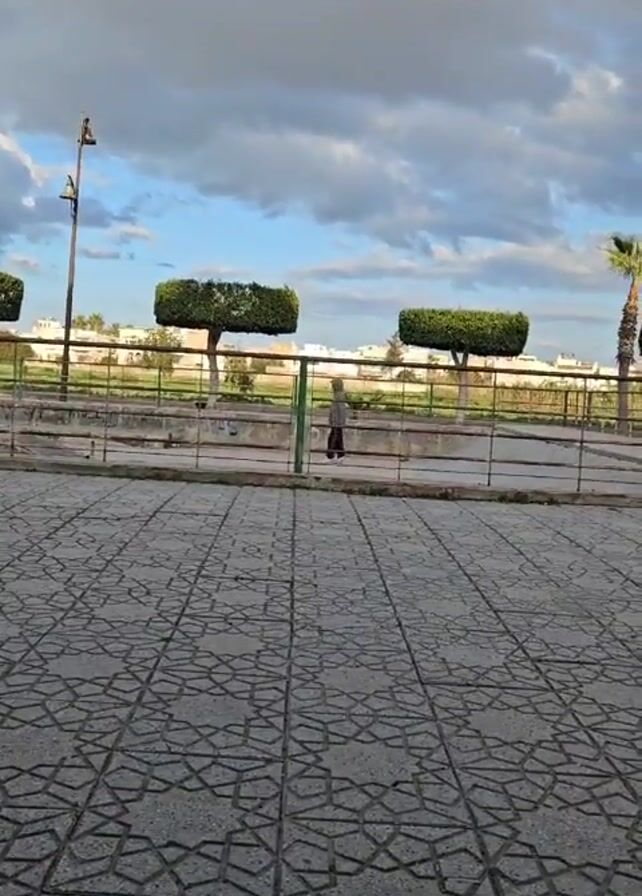 The camera focuses on a paved area with a pattern of geometric shapes, leading to a pedestrian area with a railing and two small, square-shaped trees in the distance. An individual wearing a gray hooded sweatshirt and dark pants walks slowly from right to left behind the railing. Beyond the pedestrian area, there's a green space, a road with a vehicle, and buildings in the background, under a sky with scattered clouds.
