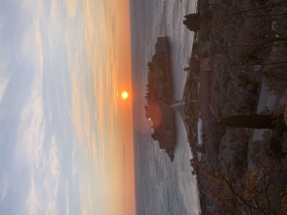 A picturesque sunset illuminates the sky and sea, with hues of orange and yellow blending seamlessly. An island, densely packed with buildings, sits in the water, connected to the mainland by a narrow bridge. Trees and foliage line the coastline, partially obscuring a building and road. Branches of trees frame the foreground, adding depth to the scene.