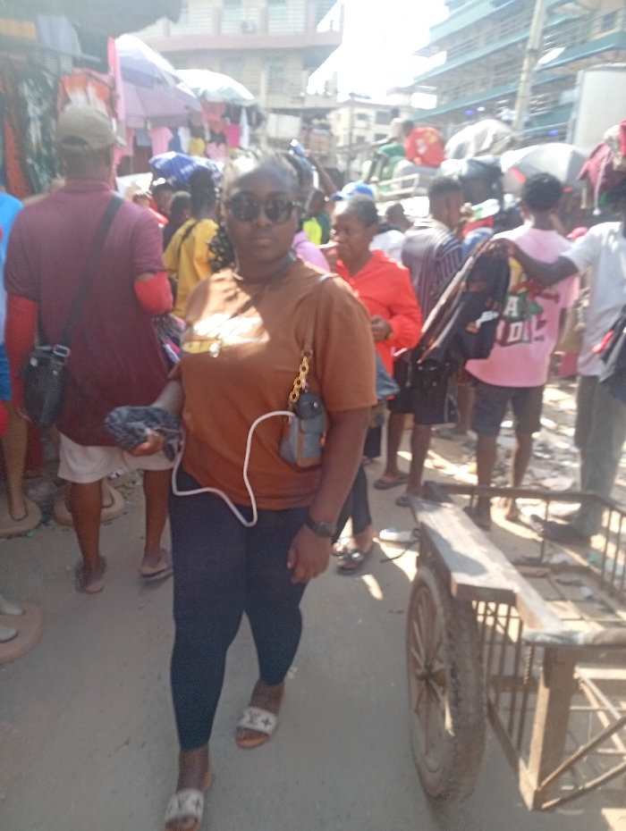 A woman wearing sunglasses, a brown shirt, and black leggings walks through a crowded outdoor market. She carries a small bag on a chain and wears sandals. Other people are milling around, shopping and walking. Background shows market stalls, buildings, and a bright, sunny day. Beside the woman is a metal pushcart.