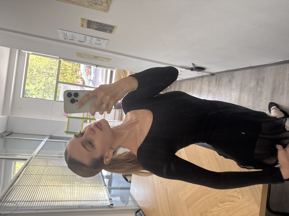 The image displays a forensic view of a female subject taking a mirror selfie inside a building in Tbilisi, Georgia. The female, appearing to be in her 20s or 30s, has brown hair pulled back into a low ponytail and is wearing a black long-sleeved leotard, a sheer black wrap skirt, and black ballet flats. She holds a light-colored smartphone, equipped with a prominent camera array, in her left hand, which bears a ring on the fourth finger. Her head is tilted slightly back and to the left, directing her gaze towards her reflection. The interior environment features white walls and a light-colored wooden floor. To the left, a large wooden table with visible grain and a dark office chair are partially visible. A window with horizontal blinds is present on the far left. To the right of the subject, a large, unobstructed window provides a view of a city street. Through this window, green foliage from trees, a light-colored vehicle, and a partial business sign reading "CHATLET" are discernible, indicating a street-level location. An easel with green and red accents is visible through the window on the left side of the frame. The wall to the far right is adorned with multiple pieces of paper or artwork, including what appears to be a medieval-style illustration and a vertical poster. Electrical cables and an outlet are visible on the lower right wall. The scene is well-lit, predominantly by natural light entering through the windows. The observable details, particularly the "CHATLET" sign, are consistent with a commercial establishment located in the vicinity of 1 Chavchavadze Avenue in Tbilisi.