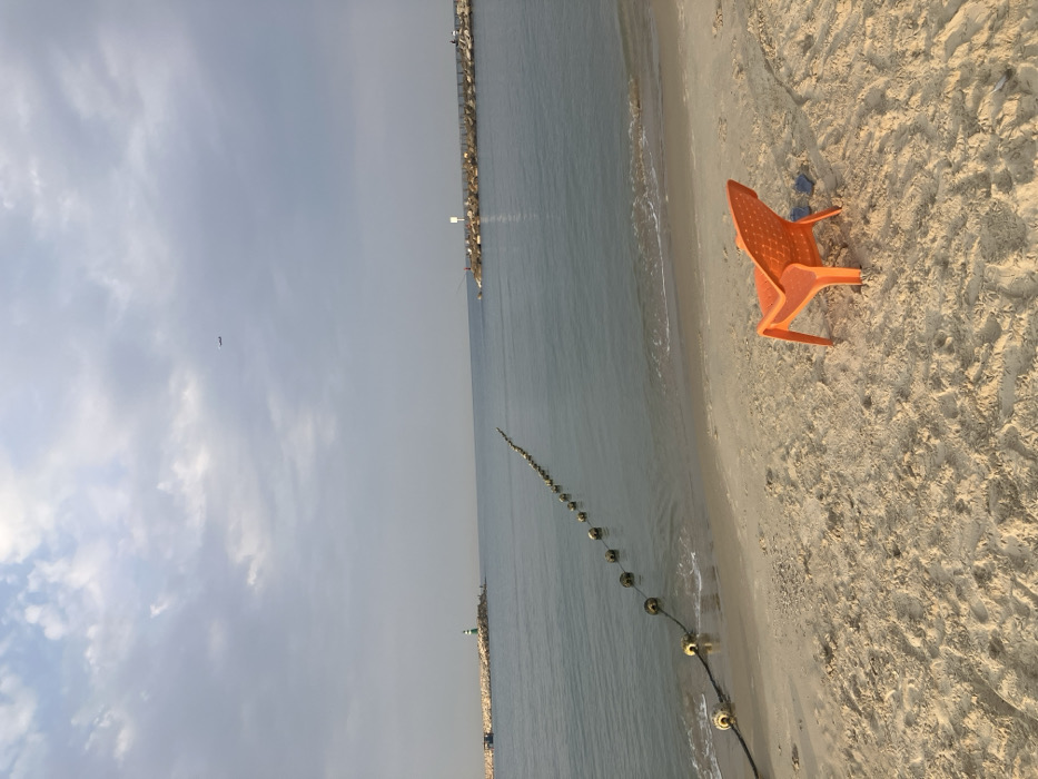 This image depicts a coastal scene at the Tel Aviv Marina in Tel Aviv, Israel. The foreground consists of light-colored sand with an orange plastic chair, partially buried, facing the water. To the left of the frame, a rope with multiple yellow and black buoys extends diagonally from the shoreline into the water, marking an area of the calm, grey-blue sea. Two stone breakwaters define the mid-distance horizon. The left breakwater features a small lighthouse with a green top, and a small blue vessel or structure is visible further out beyond it. On the right breakwater, two indistinct figures are observed, one of whom appears to be holding a fishing rod, with another fishing rod visible nearby. A white marker is also present on this right breakwater. The sky is overcast with scattered clouds, and a small aircraft is visible as a dark silhouette in the upper-center portion of the frame.