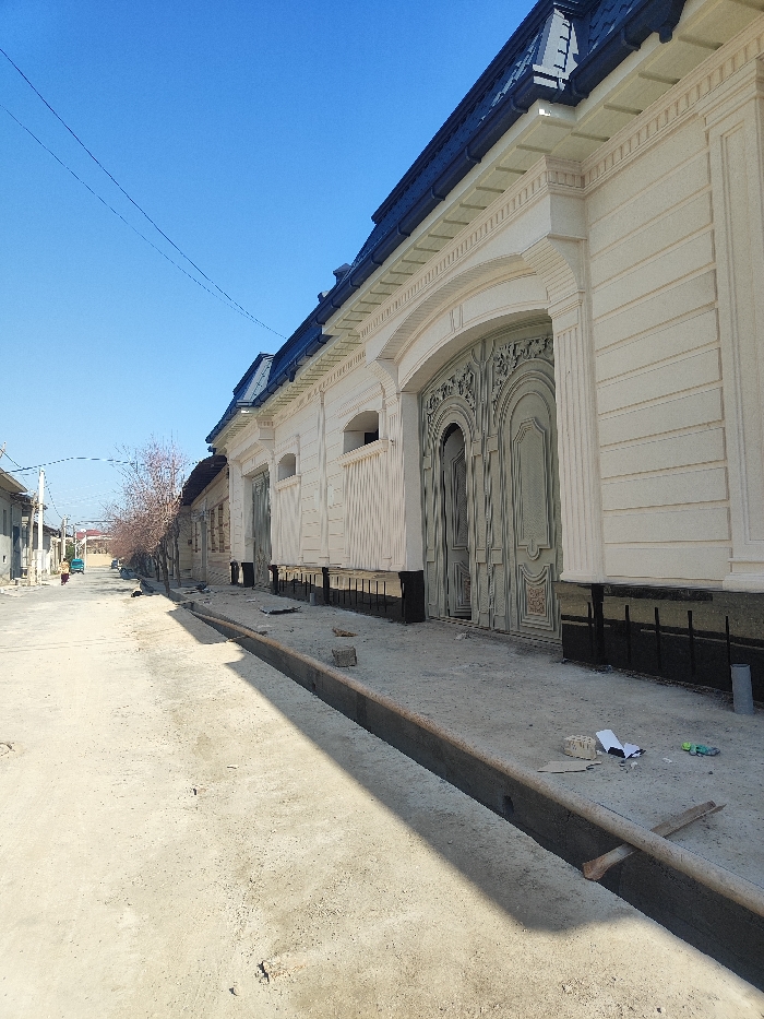 A streetscape presents a beige building with ornate doors and a dark roof. The building's facade is detailed with horizontal lines and arched features, elevated on what appear to be support beams. A concrete gutter runs along the edge of a wide, mostly empty street. A scattering of construction debris lies near the building. In the distance, a glimpse of other buildings and a sparse tree line adds depth to the scene under a clear blue sky.