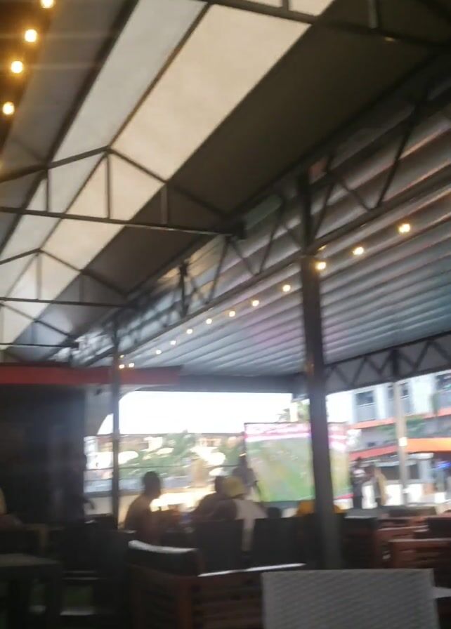 The camera angle is from low to high, inside a partially roofed, indoor/outdoor space. The roof has a corrugated metal paneling with exposed structural beams and rows of small lights. There is a large industrial fan hanging from the roof. The space includes a billiards table with a person in a red shirt approaching it. The table appears to be by "American Fitness". A person in a dark shirt can be seen in the background behind the pool table. The camera pans slightly right. There is a glass door behind the billiard table with a menu poster next to it. A Heineken sign is visible. The space also contains white plastic chairs and other furniture.