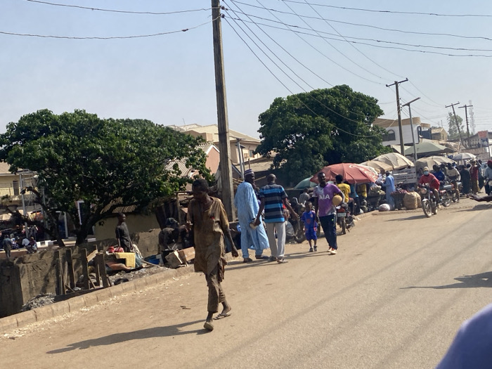 The scene depicts a busy street in Makera, Nigeria, under a clear, bright sky
