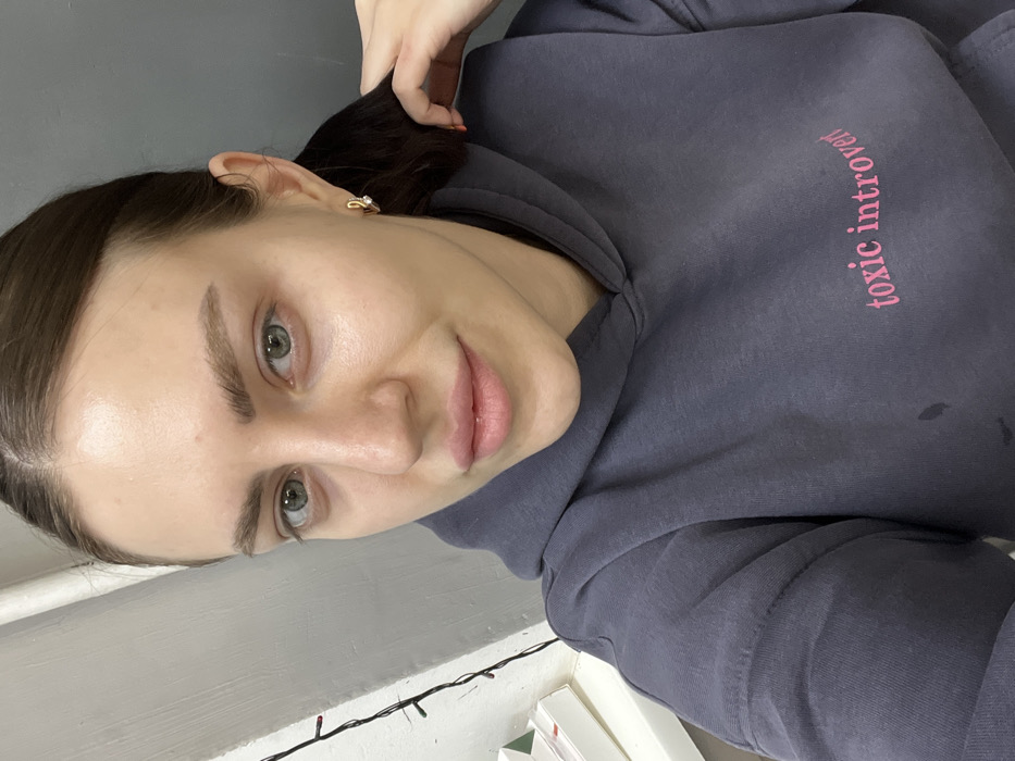 A frontal, chest-up portrait of an adult female subject is depicted, taken indoors in Rostov-on-Don, Russia. Her light brown hair is styled away from her face, revealing her ears; a gold-toned hoop earring with a white central element is visible on her left ear. She has fair skin, green eyes, and light brown eyebrows. Her lips are a soft pink, and she gazes directly towards the camera with a neutral to slight smile. The subject is wearing a dark gray hooded sweatshirt with the words "toxic introvert" printed in pink script on the chest. Her right hand, featuring nails painted an orange-red hue, is positioned at the back of her head, engaging with her hair. The background consists of a plain light-colored wall. A string of small, multi-colored fairy lights runs vertically along the left edge of the frame, and a white horizontal surface with white objects is visible below them.
