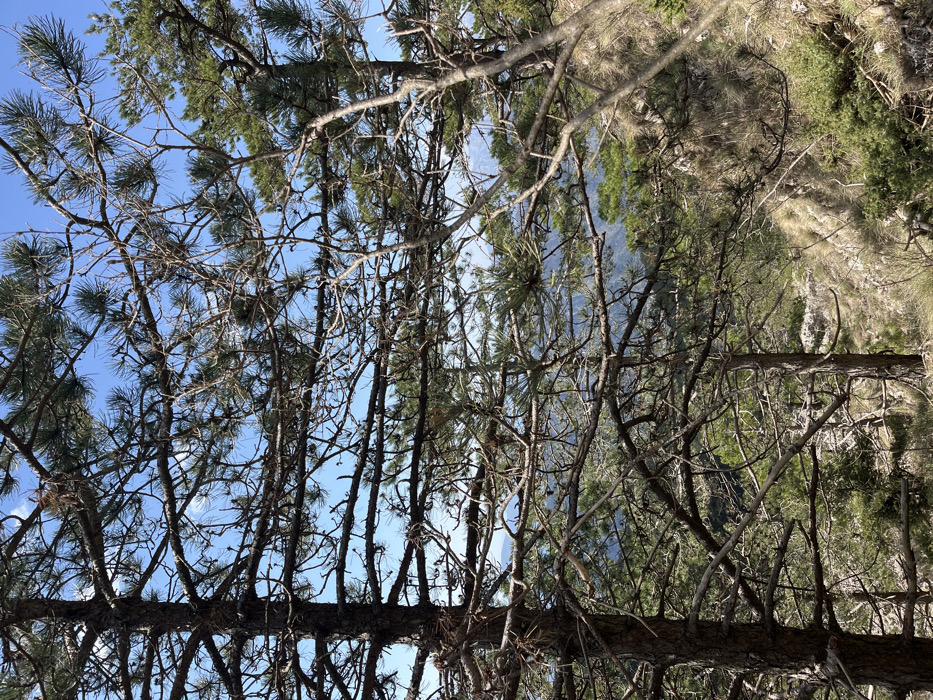 The image displays a dense, forested mountain slope in Žanjev Do, Montenegro, observed on a clear, sunny day. The foreground and midground are dominated by the trunks and intricate network of bare and needle-covered branches of multiple coniferous trees, primarily pines, against a bright blue sky with sparse white clouds. A prominent pine tree trunk occupies the left side of the frame, exhibiting rough, dark bark. Its branches extend horizontally and diagonally, forming a complex pattern that partially obscures the view beyond. Scattered green pine needles are visible on many branches, interspersed with small cones or buds. Sunlight casts distinct shadows, indicating a high sun position. Beyond the immediate tree canopy, the terrain slopes downwards to the right, covered with patches of dry, light-brown grass, smaller green shrubs, and exposed rock formations. In the distant background, rolling mountain ranges appear hazy blue under the sky, suggesting an expansive vista. There are no individuals, animals, or artificial structures visible, and no discernible actions or interactions are taking place. The environment presents as natural and undisturbed.