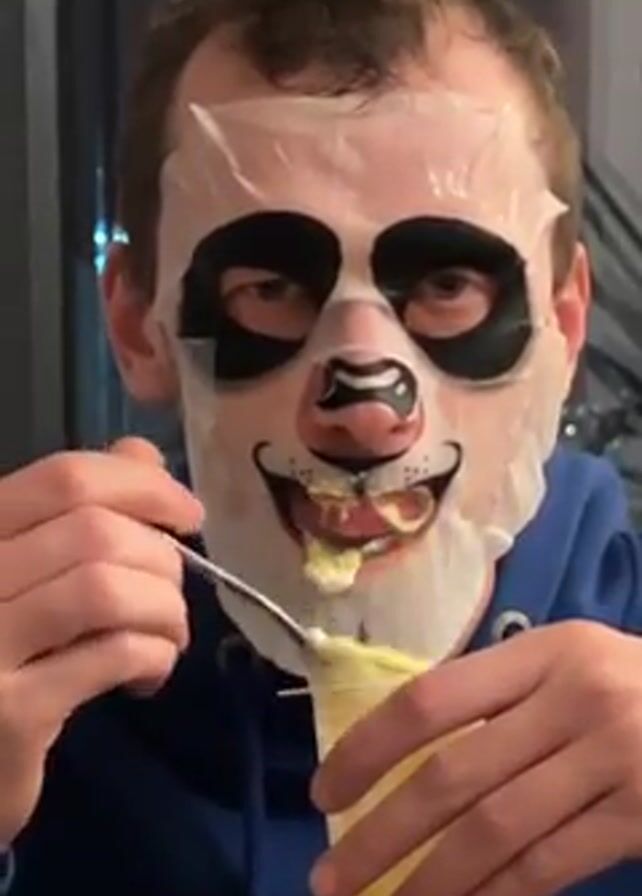 A man with brown hair and a panda face mask is eating a spoonful of yellow pudding from a small yellow container with a metal spoon