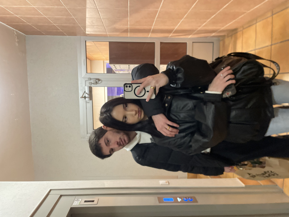 The image depicts two individuals, a male and a female, reflected in a mirror within an indoor corridor, specified to be located in the city of Cachan, France. The environment is an illuminated hallway with light-colored walls on the left and a reddish-brown tiled wall on the right. An elevator entrance, featuring a silver-colored door with blue-lit buttons, is visible on the left side of the frame. At the far end of the corridor, a double-leaf glass door with a light metal frame and visible hardware opens to another section, where white storage units or mailboxes are discernable. The female is in the foreground, positioned slightly to the right of the frame's center. She has long, dark hair and a neutral expression. She wears a black puffer jacket over a light-colored top, and light-toned pants. Her left hand, adorned with a ring on the index finger and another on the ring finger, holds a white-cased smartphone with a circular magnetic attachment on its back, indicating she is taking a mirror selfie. A black shoulder bag hangs from her left shoulder. The male stands behind and slightly to the left of the female. He has short dark hair and stubble. He wears a black puffer jacket over a white hooded sweatshirt. His right arm is around the female's shoulders, and a ring is visible on his left hand's ring finger. His left hand holds a brown paper bag with a printed design, containing items. Both individuals are looking towards their reflection in the mirror.
