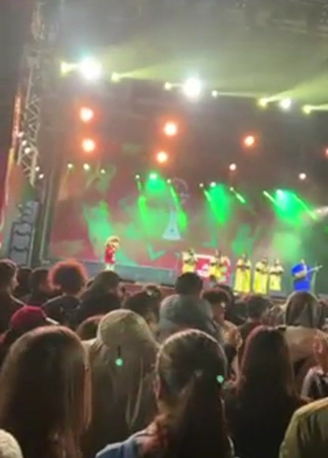 crowd of people watching a performance on a stage. The stage is lit with green and orange spotlights. On stage, there are performers dressed in yellow outfits and a person in a blue outfit. A mascot in a red suit can be seen on stage as well. The crowd is standing and facing the stage. The camera is held by someone in the crowd and moves slightly.