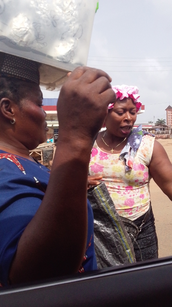 The image depicts an outdoor street scene in Igbo Ukwu, Nigeria, under an overcast sky. In the left foreground, a dark-skinned female, cropped from the chest up, wears a blue garment with a red and white pattern on the shoulder. A silver hoop earring is visible on her left ear. She balances a clear plastic container, appearing to hold foil-wrapped items, on her head, supported by a dark, mesh-like pad. Her right hand is raised near the container. Opposite her, in the midground, stands another dark-skinned female. She wears a pink ruffled head covering, a light-colored sleeveless top with a floral pattern, and a thin gold-colored chain with a cross pendant. A blue, white, and purple patterned fabric is draped over her left shoulder, and she wears dark, patterned trousers or a skirt. She holds a dark, woven bag with yellow and blue stripes. Her mouth is open, indicating speech. The two individuals are in close proximity and appear to be in conversation. The background reveals a dusty ground surface, a building with a red roof, a blue and red fuel station canopy, and a multi-tiered brown and white structure, consistent with a church, in the far right, alongside palm trees. A dark frame in the lower foreground suggests the photograph was taken from inside a vehicle.