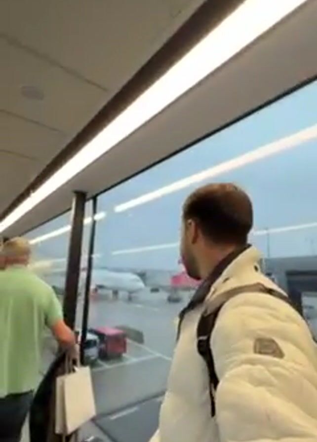 A man in a white puffer jacket walks through an airport jet bridge, looking out the window. He carries a backpack and a water bottle. Another man in a green shirt walks ahead of him. Outside the window, the airport tarmac is visible, with several airplanes and support vehicles. The sky is overcast.