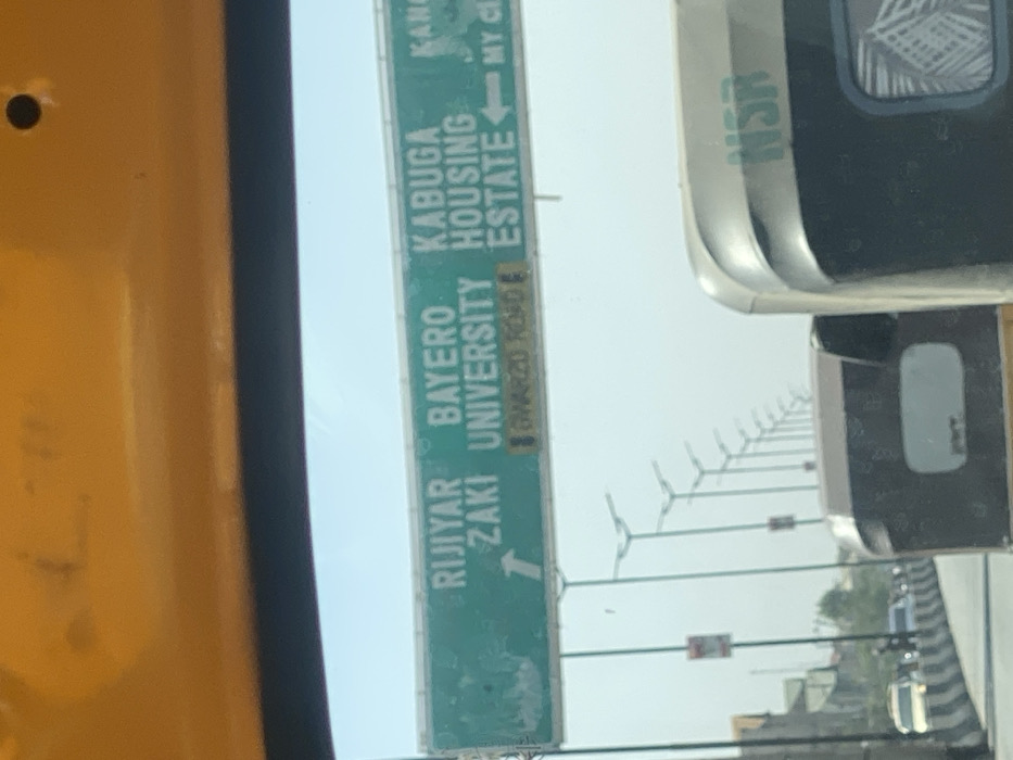 The image depicts a daytime scene from the interior of a vehicle, looking forward through the windshield. A prominent green overhead road sign is centered in the upper midground. The sign features white text indicating directions: "RIJIYAR ZAKI" and "BAYERO UNIVERSITY" (with "GWARZO ROAD" below it) both point straight ahead with an upward arrow. "KABUGA HOUSING ESTATE" and partially visible "KANG..." and "MY CI..." are indicated by a left-pointing arrow. This places the location context in or around Kabuga, a city in Nigeria, specifically near an intersection or junction leading to the Kabuga Housing Estate and Bayero University (which is in Kano, Nigeria). Below the sign, a multi-lane road extends into the distance. In the foreground on the right, the rear sections of at least two three-wheeled vehicles, commonly known as rickshaws or Keke Napep, are visible; one shows "NSR" in light green text on its back. A row of numerous modern streetlights with flat, potentially solar-powered tops lines the median or side of the road on the left, receding into the background. Distant vehicles and structures are discernible further down the road. The sky is clear and bright, indicating sunny conditions. No identifiable individuals are visible in the scene.