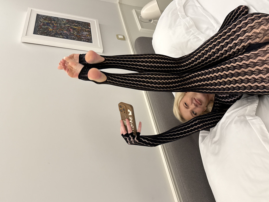 A woman in black patterned tights and a matching long-sleeved top reclines on a white bed, holding a smartphone in her outstretched hand. She winks towards the camera while taking a selfie. Her feet are positioned towards the top of the frame, showcasing the stirrup design of the tights. A framed picture hangs on the wall behind her. The room has a neutral color palette, with white walls and gray accents.