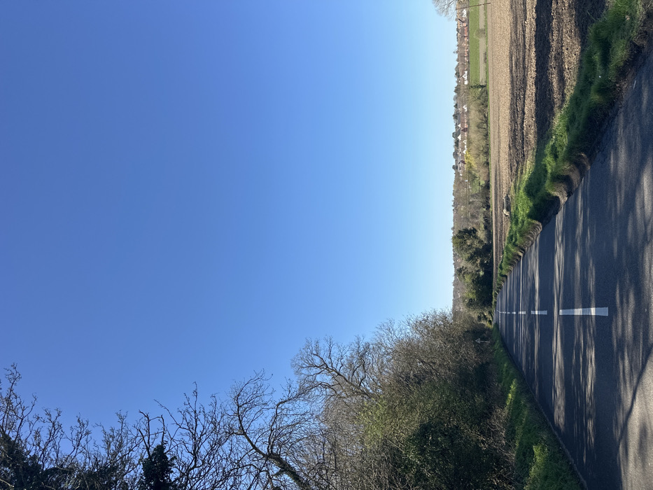 This image displays a rural landscape in Upper Upnor, United Kingdom, under a clear, cloudless blue sky. A single-lane asphalt road, marked with a dashed white center line, extends from the foreground into the background, curving slightly to the left. On the left side of the road, a dense boundary of trees and shrubs exhibits a mix of bare branches and light green early-spring foliage. A white triangular road sign is partially obscured within this vegetation approximately midway down the visible road section. The right side of the road features a narrow strip of green grass verge, transitioning into a large, ploughed brown field. In the far distance, beyond the field and a band of trees, a cluster of residential structures with reddish roofs is discernible. The scene is brightly illuminated by direct sunlight, casting shadows from the roadside trees onto the asphalt. No individuals, vehicles, or animals are present.