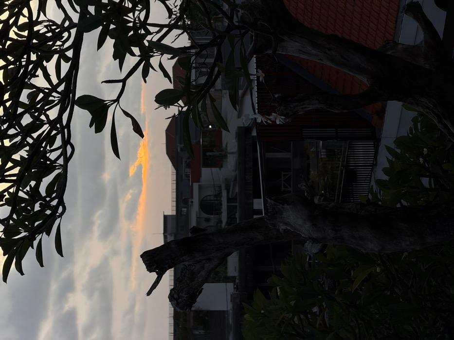 - "The image displays an urban twilight scene in Tibubeneng, Indonesia, viewed through the dense, silhouetted foliage and gnarled trunks of foreground trees, likely Frangipani" by FM-Y4jCb2, licensed under CC BY 4.0