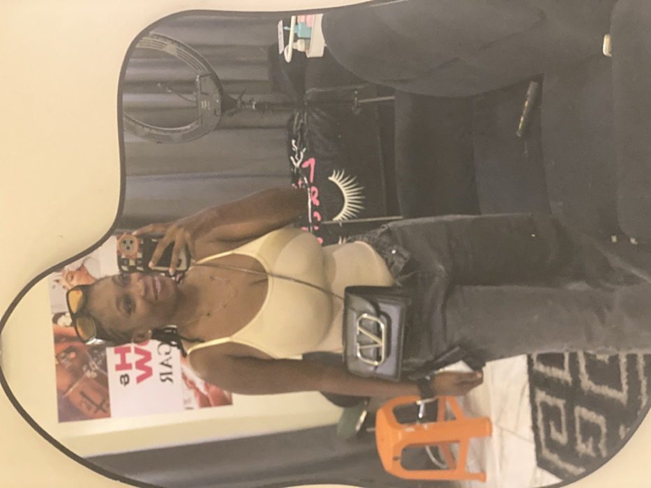 A woman with sunglasses on her head takes a mirror selfie. She wears a light yellow tank top, dark pants, and a small black purse with a metal V. Behind her are posters, a ring light, a black t-shirt with a design, and a dark sofa. The woman smiles slightly while holding her phone. An orange plastic stool is visible near her leg. The mirror has an irregular shape with a black rim.