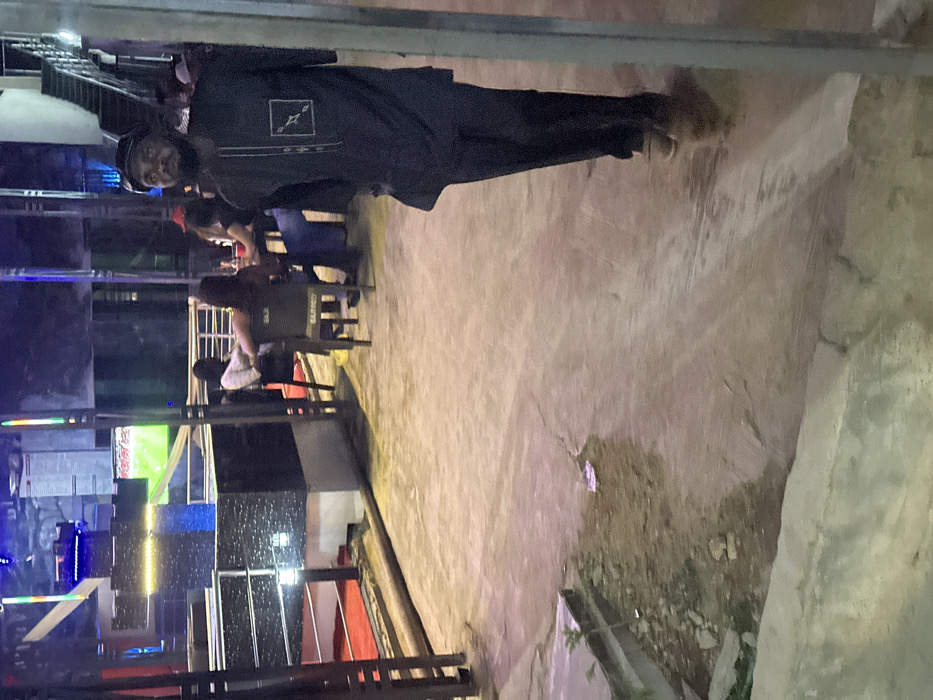 A man in a black garment and cap stands on a concrete surface. Behind him, a building with illuminated stairs and neon lighting is visible. People sit at tables in the background, suggesting an outdoor seating area. The composition is slightly rotated and the lighting is a mix of artificial and natural, contributing to an overall nocturnal ambiance.
