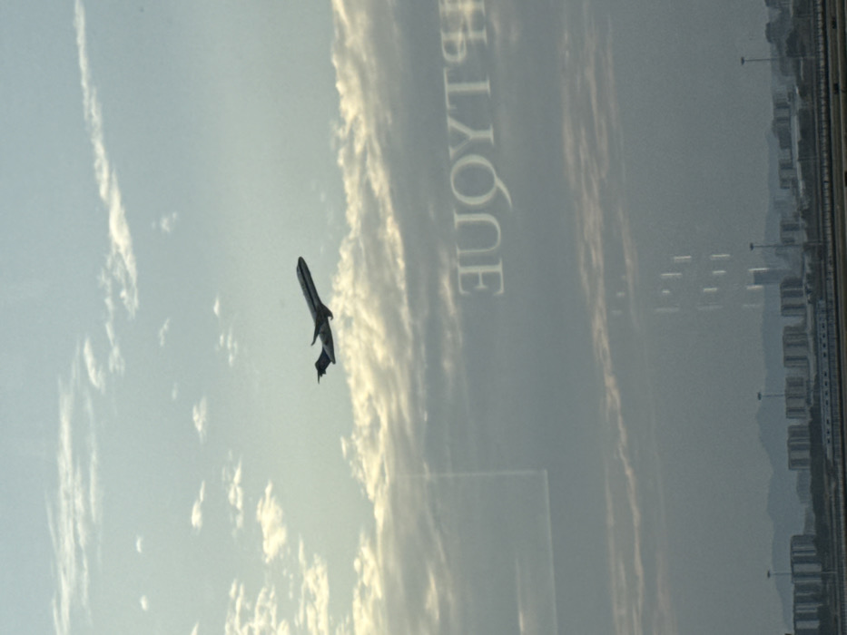 The image depicts an exterior view, likely captured from inside a terminal building at Guangzhou Baiyun International Airport (CAN) in Guangzhou City, China. The upper portion of the frame shows a partially cloudy sky with patches of light blue. A twin-engine commercial jet airliner, dark in silhouette, is visible in the upper half of the image, ascending rapidly against the sky. Its tail fin and wings are discernible. The lower half of the image reveals reflections on the viewing window. Prominently, mirrored stylized white lettering, appearing as "BUOYTPE," is reflected against the clouds in the mid-ground. Other faint reflections indicate internal structures or lighting. Below the reflections, the airport's ground infrastructure is visible, including what appears to be part of a runway or taxiway. In the far background, a cityscape with numerous buildings extends to the horizon, where distant, hazy mountains are visible under a muted sky. No individuals or specific interactions are discernible.