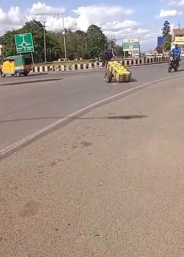 The scene appears to be a moderately busy road intersection in an urban or semi-urban setting, likely during daytime. A man pulls a yellow cart loaded with cylindrical objects along one side of the road. A motorcycle with two riders passes by. Other vehicles including a green three-wheeled vehicle and additional motorcycles are visible. A man walks on the side of the road. The sky is partly cloudy. There are buildings and trees in the background, along with street signs.