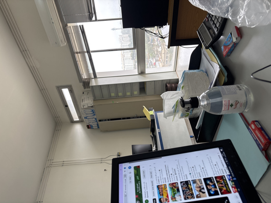 The image depicts an office interior situated in Rabat, Morocco. In the foreground, a black monitor displays the YouTube interface with various video thumbnails and titles, some in Arabic and some in English. To the right of the monitor, on a light-colored desk, are a clear plastic bottle of "Solutin Désinfectant" hand sanitizer with a pump top, a white tissue box, a black electronic calculator, and two red and white gum packets, one partially open. A light blue desk pad is visible under the monitor, and a clear plastic bag rests near the calculator. The office features white walls with exposed electrical conduits running along the upper sections and ceiling. Two light-colored metal filing cabinets, one partially open, stand against the back wall, topped with stacked white boxes. One cabinet has multiple vertical compartments, many containing yellow sticky notes. A second, darker computer monitor is visible on a desk further back in the room. An air conditioning unit is mounted on the wall above a large window, which is fitted with horizontal blinds in its upper section. A smaller, high horizontal window is positioned above the filing cabinets. A brown waste bin is visible beneath the main window. Through the large window, an urban cityscape is visible under an overcast sky. The view includes numerous multi-story buildings, densely packed vehicle traffic or parked cars on lower levels, and a prominent communication tower in the distance.