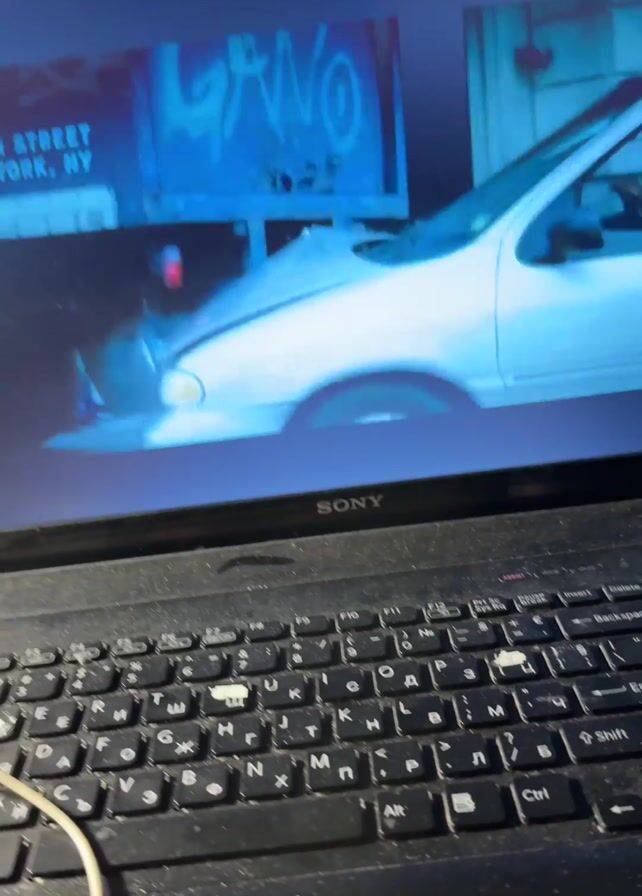 The video depicts a scene viewed on a Sony laptop screen, showing a man crawling from underneath a large vehicle, possibly a truck. The scene has a blue hue. The man appears disoriented and surprised as he emerges from beneath the vehicle. The laptop's keyboard is visible in the foreground and appears somewhat dusty.
