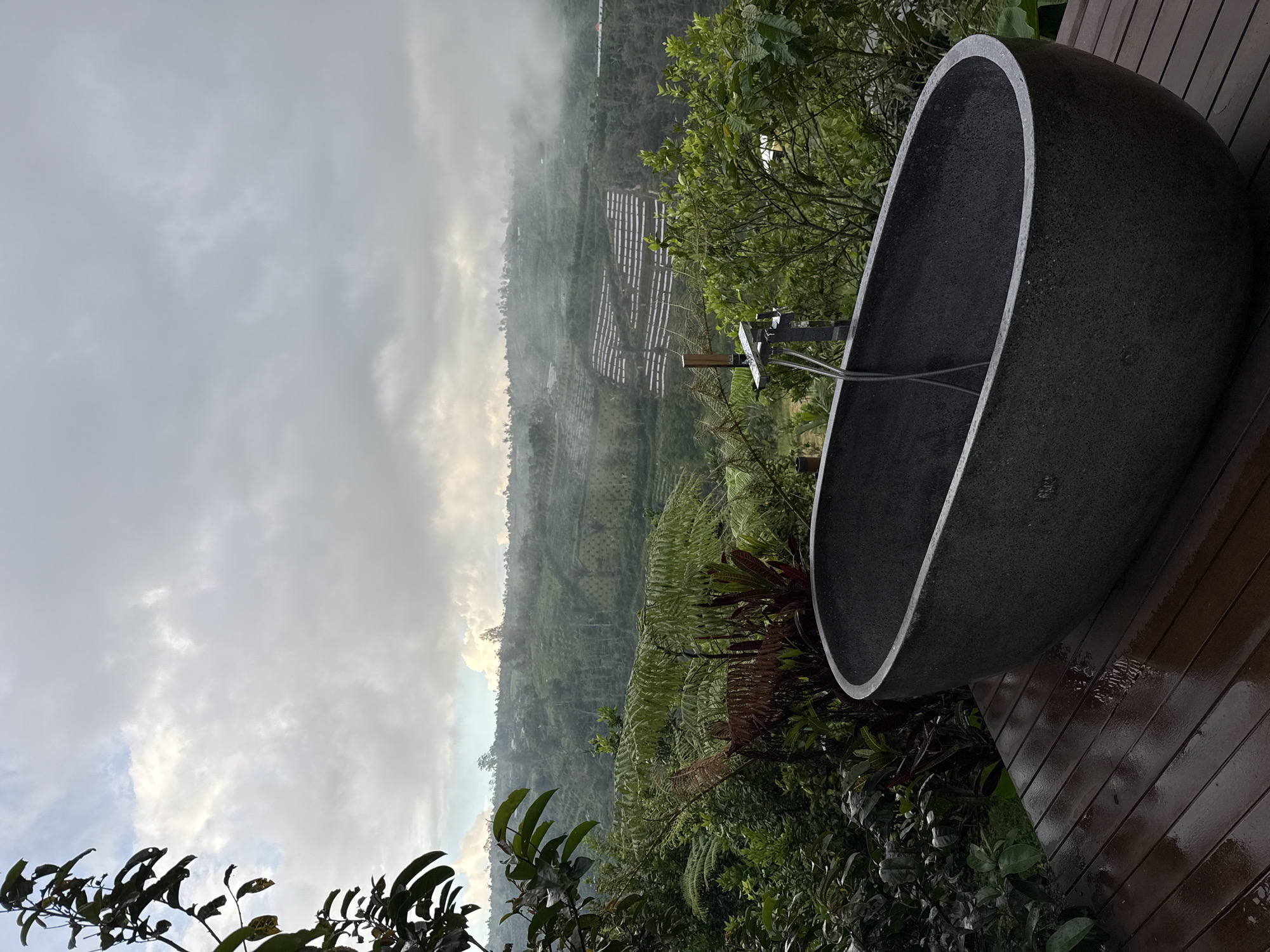 n outdoor bathtub overlooking a verdant landscape with rows of vegetation in Petang, Indonesia. The tub, constructed from a dark, speckled material, sits on a wet wooden deck. A silver faucet and shower attachment are attached to the tub. Lush greenery surrounds the deck, partially obscuring the view of the valley. Low-hanging clouds and mist obscure the distance.