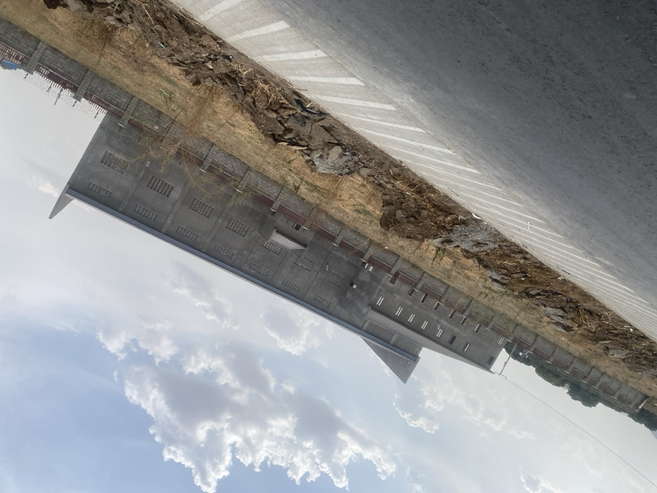 The image depicts an exterior scene in Pasere, Nigeria, under a blue sky with scattered white cumulus clouds. A large, multi-story building, constructed of grey concrete blocks, is positioned in the midground. It features numerous rectangular openings, presumed to be windows, arranged in horizontal rows along its visible facade. The building's right side terminates in a distinct, upward-sloping, pointed roof structure. A perimeter wall of concrete blocks, topped with what appears to be razor wire or barbed wire, encloses the building's property. The ground between the building and the foreground road consists of an undeveloped area of dry, light-brown earth with sparse, desiccated vegetation and a visible dirt and rock embankment adjacent to the road. The foreground shows a dark asphalt road with multiple parallel white dashed lines painted on its surface. No people, animals, or vehicles are present in the scene.
