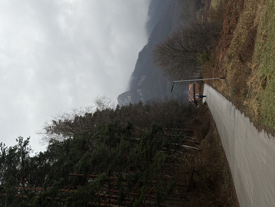 An image captured in Zgorigrad, Bulgaria, depicts a paved asphalt road ascending into a mountainous, forested landscape under an overcast sky
