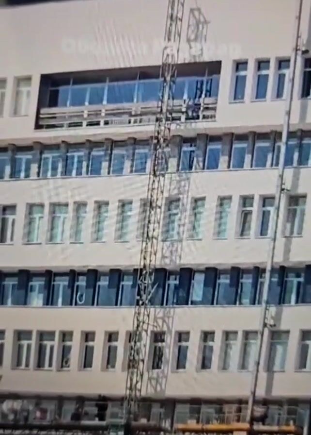 multi-story building, identified as "Община Разград" (Municipality Razgrad) in the overlay text. Black smoke is emanating from the top of the building. There is construction scaffolding on one side of the building. The sky is blue. There are trees in the foreground. The camera appears to be zoomed in on a screen.