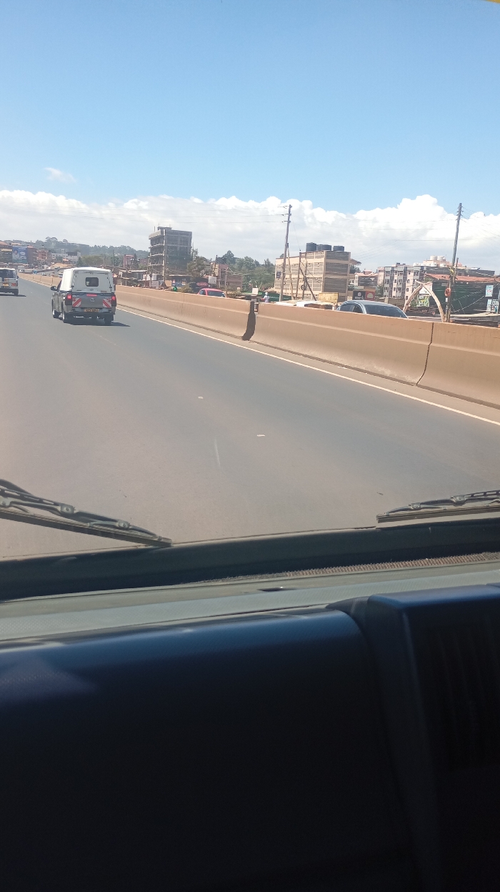 The image depicts a daytime scene from the interior of a vehicle looking forward through the windshield, specifically located in Kinoo ward, Kenya