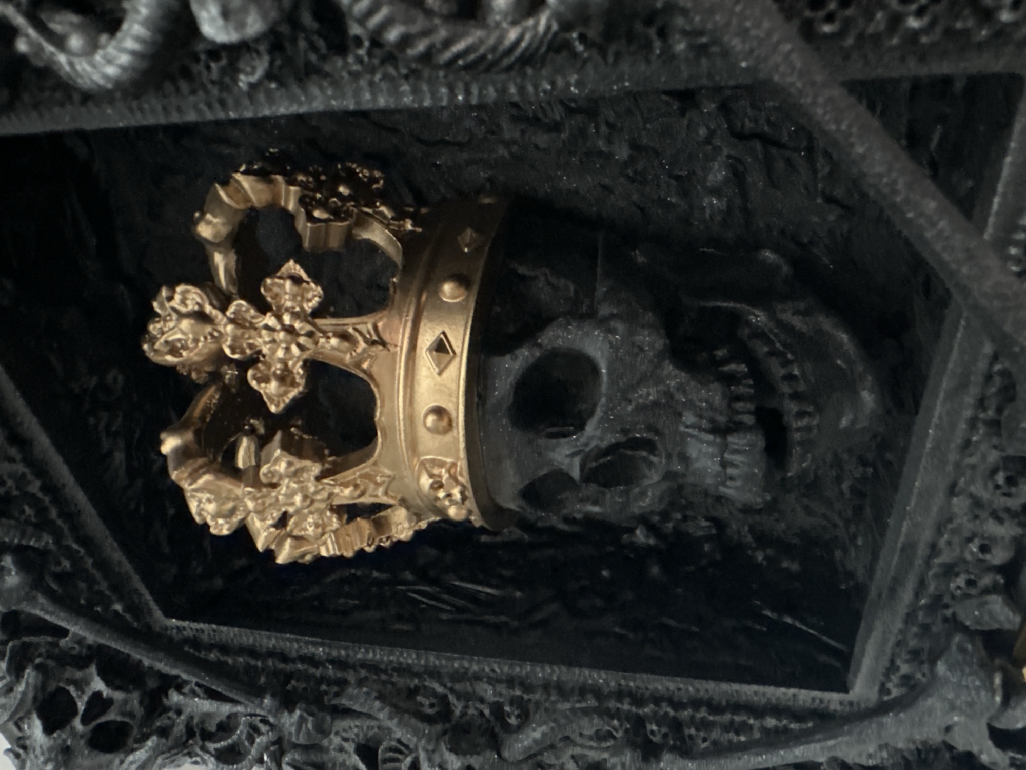 The image displays a dark, three-dimensional representation of a human skull, rendered in a rough, matte black or very dark grey material, positioned within an ornate, similarly dark frame or recess. A prominent golden crown, highly detailed with crosses, floral patterns, and geometric elements, rests on the skull's cranium. The skull exhibits open eye sockets and nasal cavity, with visible teeth in a slightly agape jaw. The surrounding frame and background are intricately sculpted with dark, Gothic or organic motifs, including what appears to be a row of smaller skulls along the lower interior edge of the frame. The overall scene is dimly lit, emphasizing the metallic sheen of the crown against the textured, somber tones of the skull and its setting. The exact location within Rostov-on-Don, Russia, cannot be determined from the visual information provided in the image.