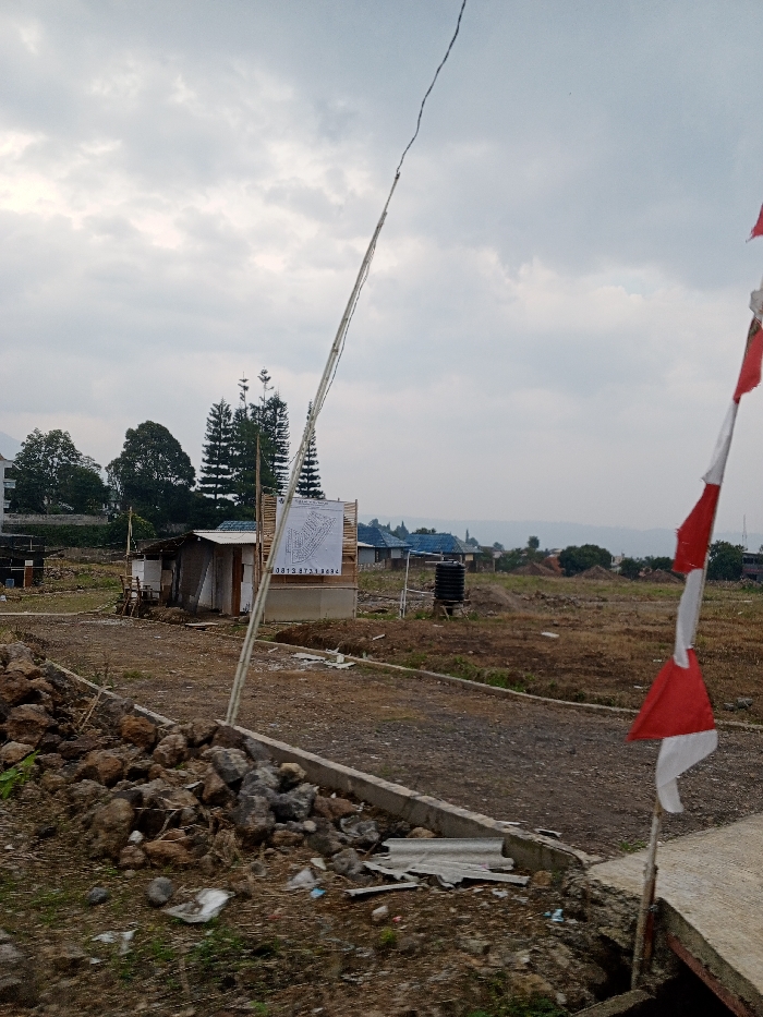 The image displays an expansive, undeveloped land area under an overcast sky. In the immediate foreground, a pile of rocks, dirt, and construction debris is visible, alongside broken concrete pieces. To the right, a vertical pole supports a red and white flag. The ground throughout the midground is largely unpaved dirt with sparse, dry vegetation and visible tire tracks or pathways. In the midground-left, a small, makeshift structure with a corrugated metal roof and light-colored walls stands, featuring a brown door. Adjacent to this structure, a tall, slender pole, appearing to be constructed from white PVC pipes, supports an overhead electrical wire that extends diagonally across the upper left sky. Attached to this pole, or a nearby wooden frame, is a large white banner displaying a black-and-white site plan diagram. Below the diagram, text is visible, including the phone number "0813 9731 8694." To the right of this sign and further back, a black cylindrical water tank rests on the ground. The background features additional scattered, low-rise buildings, some with distinct blue roofs, interspersed with trees, including several tall, conical evergreens. A hazy, undulating mountainous or hilly landscape stretches across the distant horizon. No individuals are present, and no specific actions or interactions are depicted. Regarding the specified location, the image does not contain any visual identifiers for Kheda, India. Instead, the visible phone number "0813 9731 8694" is a common prefix for Indonesian mobile service providers, and the red and white flag is consistent with the national flag of Indonesia, suggesting the scene is located in Indonesia.
