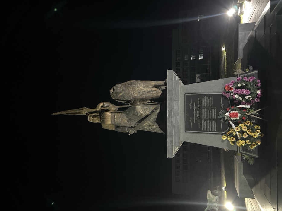 This nighttime photograph, taken in Rakovski, Bulgaria, depicts a bronze monument illuminated by multiple ground-level spotlights