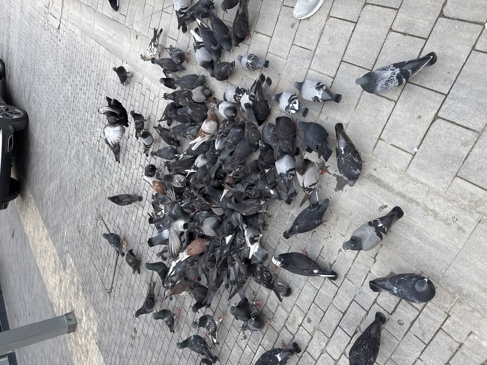 The image depicts a large flock of pigeons gathered on a cobblestone sidewalk in what appears to be an urban area. The majority of the pigeons are gray, black, and white. They are concentrated in the center of the frame, while some are dispersed around the edges. A portion of a car is visible on the left side of the frame. A pair of sneakers are seen at the top of the frame. The cobblestone pavement is gray and shows signs of wear and weathering. Given the prevalence of pigeons in urban spaces in Tel-Aviv, Israel, and the general style of pavement, this might be the location.