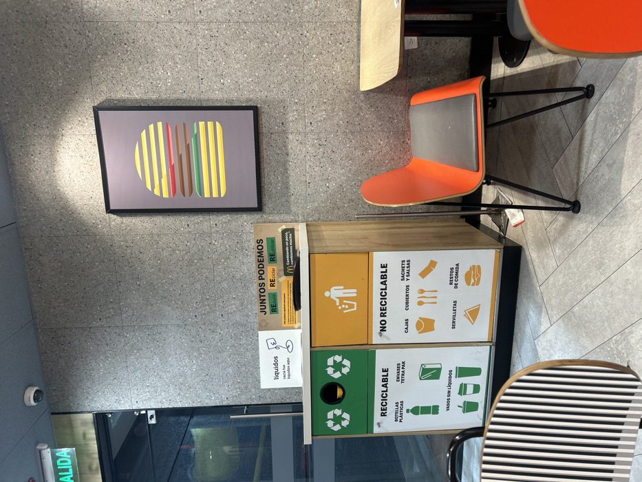 wall with a framed burger image and a triple-compartment recycling station. The top compartment is for non-recyclable items like food waste and wrappers. The bottom is for recycling plastic bottles, Tetra Pak containers, and drink cups (empty). A sign indicates "liquids" for pouring them out. The recycling station includes the slogan "Juntos podemos" (Together we can) for reducing, reusing, and recycling. A table and chairs are nearby.