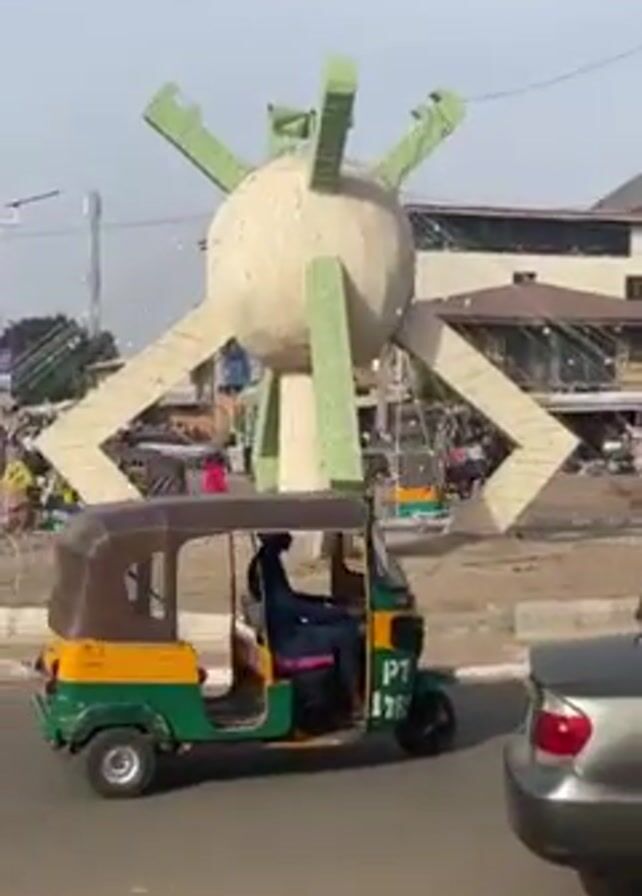 street scene in a city or town. In the center of a roundabout is a large, white, ball-shaped sculpture with green, arm-like extensions. Two auto rickshaws, painted in yellow and green, drive around the roundabout. A gray sedan is also present. A sign for "GOD BLESS ANACO DIGITAL ENT." is visible, advertising a digital photo store. A man wearing a black shirt and white cap walks past the sign. Stacks of foam in varying colors are visible on the side of the road. Buildings and shops line the street, and people can be seen walking around. The sky is partly cloudy.