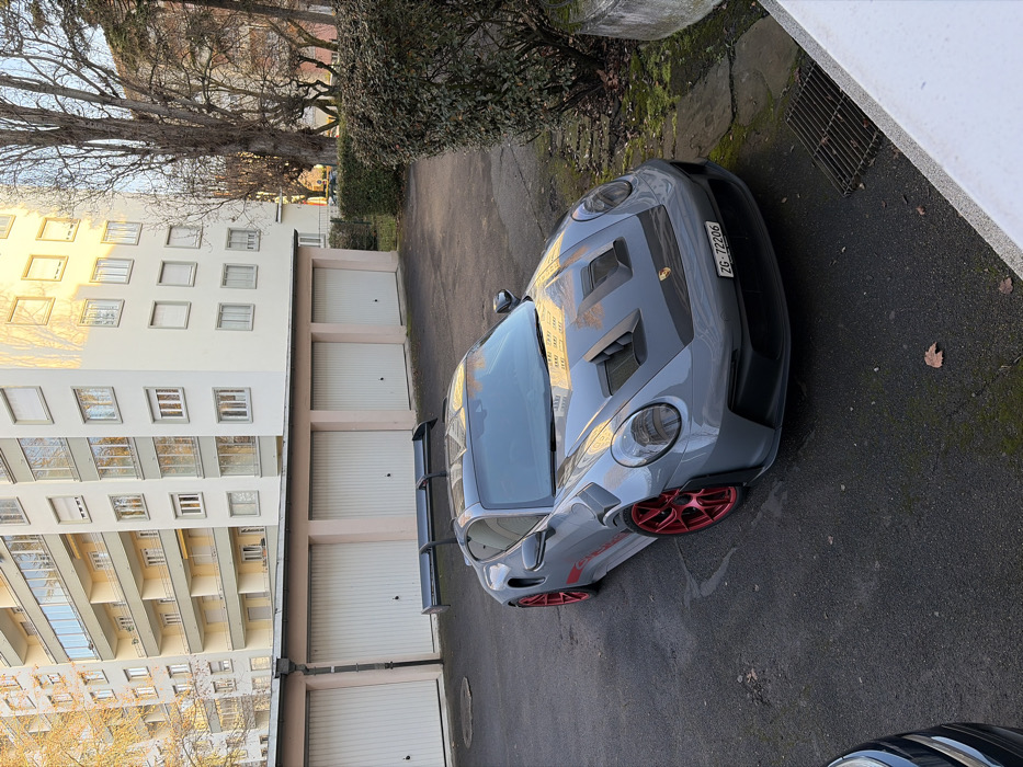 This image depicts an outdoor residential setting. A grey Porsche 911 GT3 RS (992 generation) is prominently parked on an asphalt driveway. The car features red multi-spoke wheels, a large black rear wing, and black vents on the front hood. A red 'GT3 RS' decal is visible along the side. The front license plate displays "ZG - 72206", which indicates registration in the Canton of Zug, Switzerland. The vehicle is positioned in front of a row of five identical white garage doors with light pink architectural trim above them. These garages are integrated into the base of a multi-story, light-colored apartment building with numerous windows and balconies. Sunlight reflects off parts of this building. To the right of the garages, bare deciduous trees and a well-maintained green hedge are visible, with another apartment building partially seen further in the background. A small section of a dark-colored vehicle's front fender and wheel is visible in the bottom left corner of the frame. The asphalt ground is uneven, featuring scattered dry leaves and patches of moss or algae. A metal grate drain is present in the bottom right foreground. The scene is illuminated by natural sunlight, suggesting a clear day during the colder months, given the bare trees.