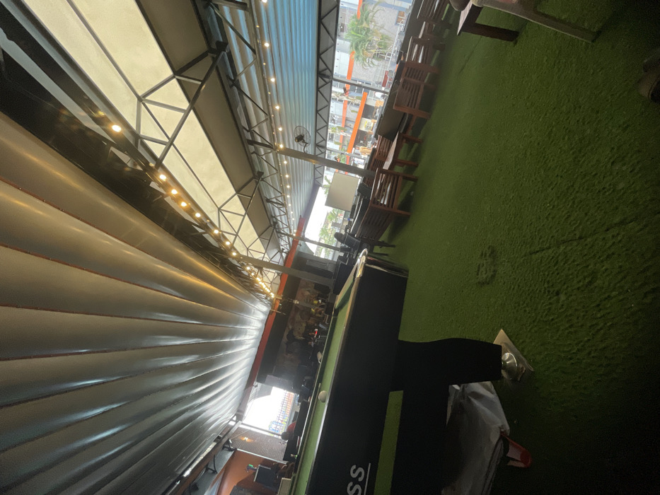 - "An indoor/outdoor space features a pool table and wooden tables with benches on a green turf" by FM-GeCHu1, licensed under CC BY 4.0