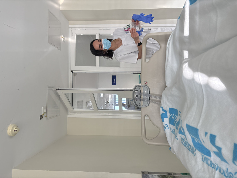 The image depicts an interior scene within what appears to be a medical facility, specifically a hospital room or ward. A female healthcare worker with dark hair, wearing a white medical uniform and a light blue surgical mask, stands on the right side of the frame, positioned behind the foot of a hospital bed. She is holding a clear plastic bag containing medical supplies, possibly an IV bag, and two blue disposable gloves. Her left wrist displays a watch. In the foreground, a hospital bed with a beige headboard is partially visible, covered with a white blanket featuring blue patterns and the partially visible word "DIODOS." Transparent tubing is attached to a grey medical device mounted on the bed's headboard. The background consists of light-colored walls and white doors with glass panels. One door is partially open, revealing a corridor or adjacent room. A blue sign with white text "Almacén 2" (Spanish for "Storage 2") is visible on a door or wall in the distance. A reflection of another individual, possibly also in medical attire, is faintly visible through the glass panels of the open door. The white ceiling features a round smoke detector, two rectangular access panels, and recessed lighting fixtures. Natural light illuminates the scene from the right, casting shadows across the bed. The location is an unknown city in an unknown country, though the Spanish text indicates a Spanish-speaking region.