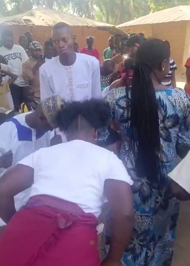 group of people dancing in an outdoor setting, seemingly at a social gathering or celebration. The camera appears to be held by someone in the crowd, moving slightly with the rhythm. The main focus is on a man in a white traditional outfit, who is the central figure in the dance. Other people are gathered around, some holding phones as if recording or taking pictures. The surrounding environment shows simple structures, suggesting a rural or semi-rural area. The ground is visible, showing some dirt or sand. The video seems to capture a lively, spontaneous moment.