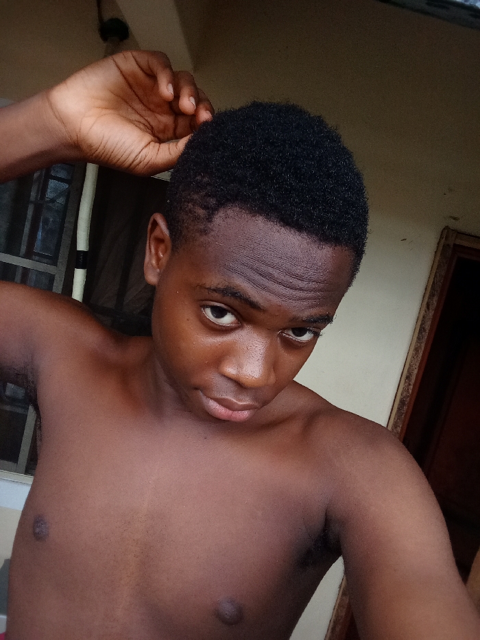 A young dark-skinned male is captured in a headshot, bare-chested, against an indoor or semi-outdoor background in Elelenwo, Nigeria
