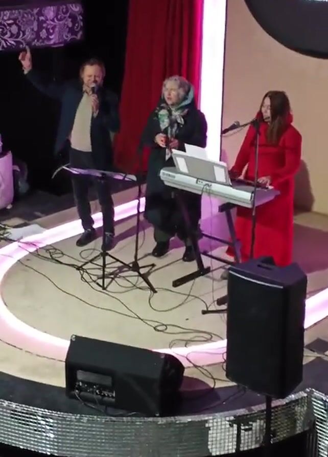 A band of three people are performing onstage for an audience. The band consists of a man singing and gesturing with his hand, a woman singing, and another woman playing a keyboard. The audience is seated and clapping along with the music. The stage is decorated with purple and pink lights.