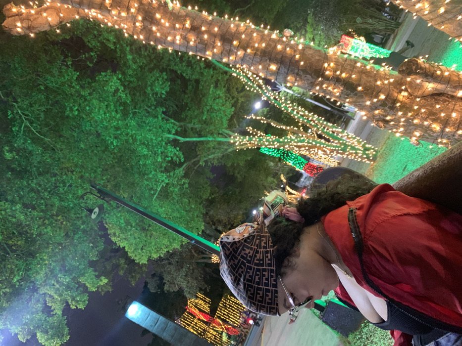 A person with a headscarf and glasses sits outdoors at night. The person wears a red jacket and necklace. Decorated palm trees and greenery surround the person. Fairy lights are wrapped around the palm trees, while trees with green leaves are situated behind. A street lamp is visible in the distance.