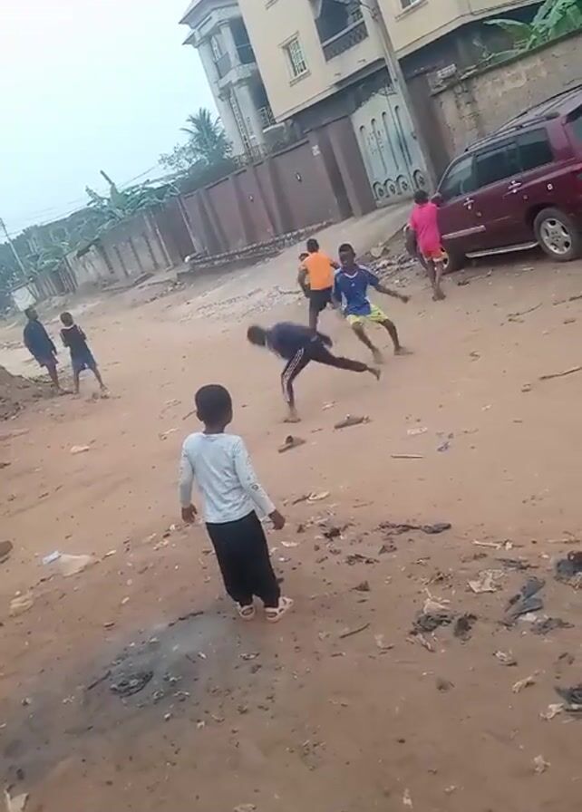 Several children are playing on a dirt road in front of a multi-story building. Six children are in motion; one is wearing an orange shirt and another a pink outfit. A child in a white shirt and dark pants watches them. A red SUV is parked on the side of the road. There is trash scattered on the ground. The sky is overcast. A fence runs along the side of the road and around the building. A child in a blue and yellow patterned dress watches from the right side.